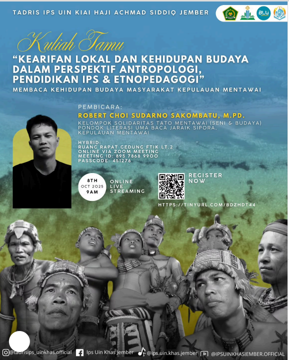 Jember – Bagaimana kehidupan budaya dan kearifan lokal masyarakat Pulau Mentawai dapat menjadi inspirasi dalam pendidikan, khususnya pembelajaran Ilmu Pengetahuan Sosial (IPS)? Pertanyaan inilah yang akan dikupas tuntas dalam Kuliah Tamu Tadris IPS 2025.