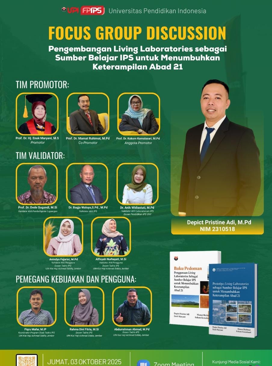 FGD ini mengusung tema “Pengembangan Living Laboratories sebagai Sumber Belajar IPS untuk Menumbuhkan Keterampilan Abad 21”. Kegiatan tersebut melibatkan berbagai pihak, mulai dari tim promotor, tim validator, hingga pemegang kebijakan dan pengguna.
